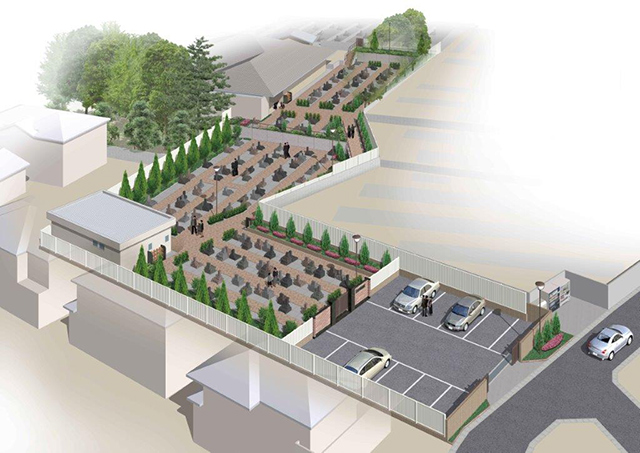 次にその環境ですが、同園は街の中心にありながらその喧騒をのがれた閑静な住宅街にあります。園内は植栽をふんだんに取り入れ、緑豊かな心落ち着く空間を実現。四季折々の美しい自然が眠る人を温かく包み込み、そして訪れる人の心を癒す、故人との語らいを心置きなく出来るよう設計いたしました。